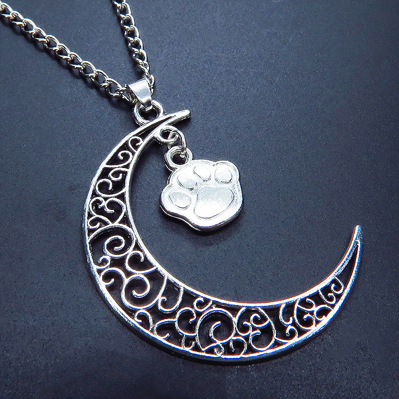 - アンティークシルバー 透かし三日月と肉球の大人可愛いネックレス ムーンネックレス 猫 犬 銀古美
