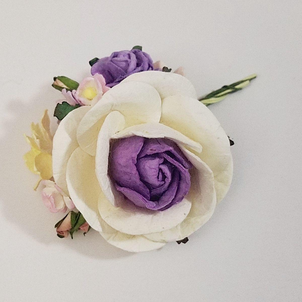 > 造花[ミニ・ペーパーフラワー 髪飾り/コサージュ/アクセサリー(バイカラー/白&紫 #) 約50mmサイズ 1個] ハンドメイド アートフラワー