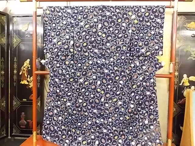 > きもの今昔4469 小紋のきもの 広衿袷仕立て 正絹一越地紺色にランダムに配置の亀甲柄と小花柄 身丈154cm