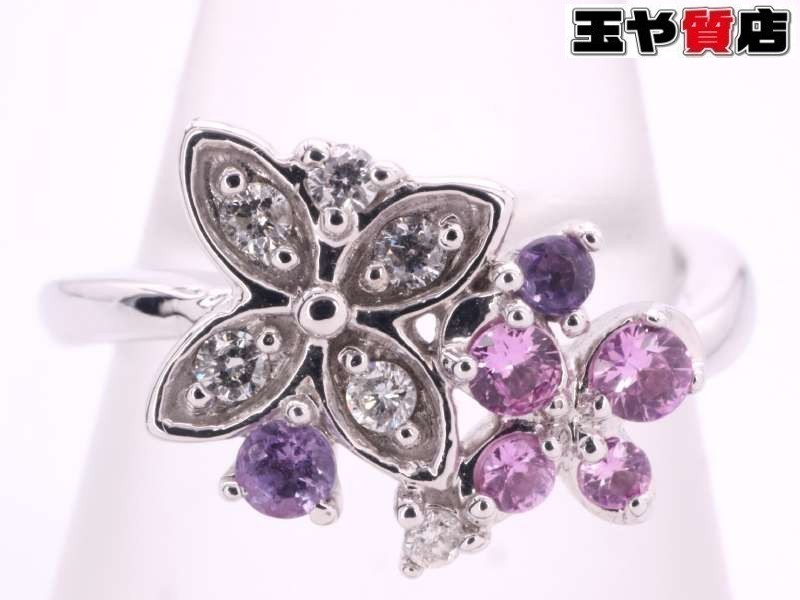 - 4℃ 美品 カラーストーン フラワー デザイン リング 10号 K18WG ホワイトゴールド