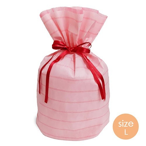 - 送料込 ラッピング 袋 ギフトバッグ 不織布 リボン付き ( ボーダー L ピンク ) 15811 マチあり 巾着 袋 赤 ラッピング グッズ 用品