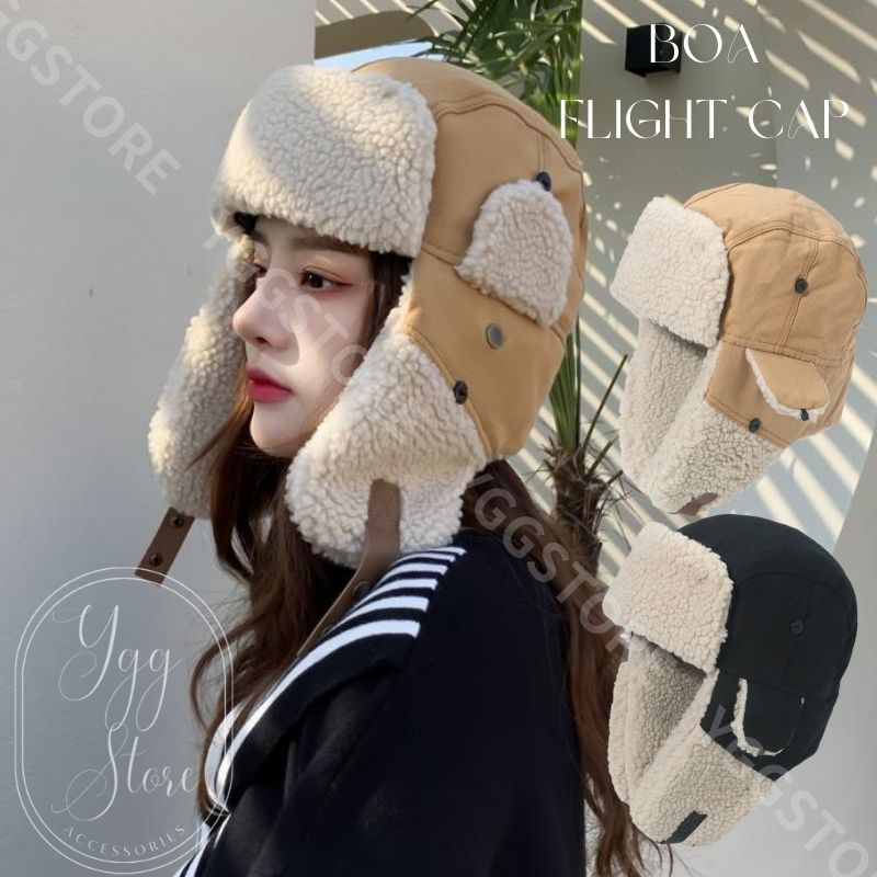 > 2色あり★ボア フライトキャップ 男女兼用 帽子 ブラック 黒防寒 飛行帽 耳あて スノボ スキー アウトドア アビエーター ハット
