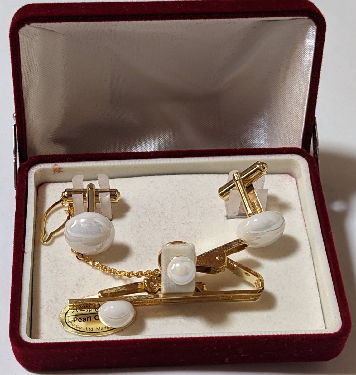 - 人工パールセラミック カフス+わに口式ネクタイピン+タイタック ケース+外箱あり 昭和レトロ