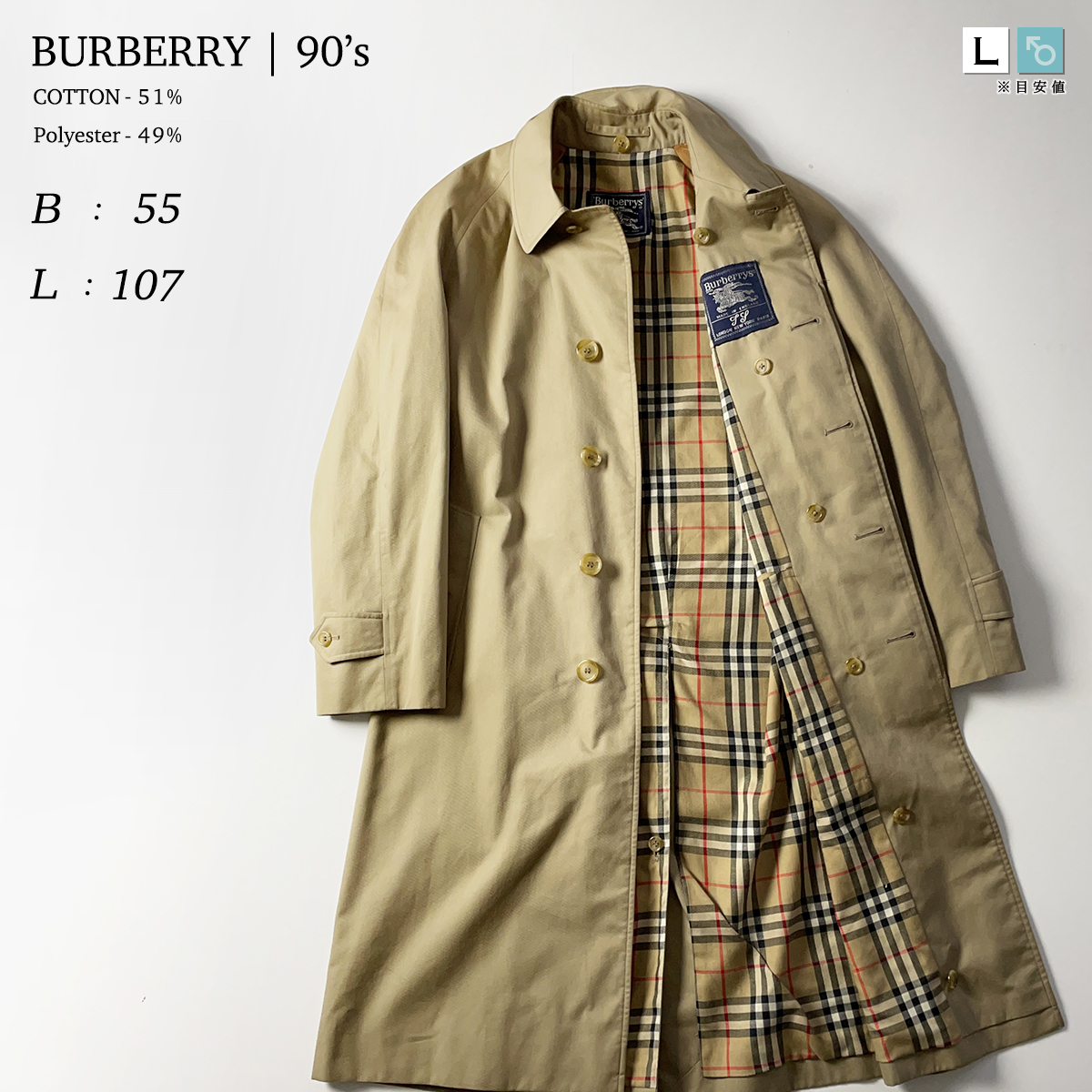 - BURBERRY 90s ヴィンテージ 薄手 ロング バルマカーン コート ベージュ 比翼 ラグラン 春 秋 冬 ギャバジン スーツ ビジネス バーバリー L