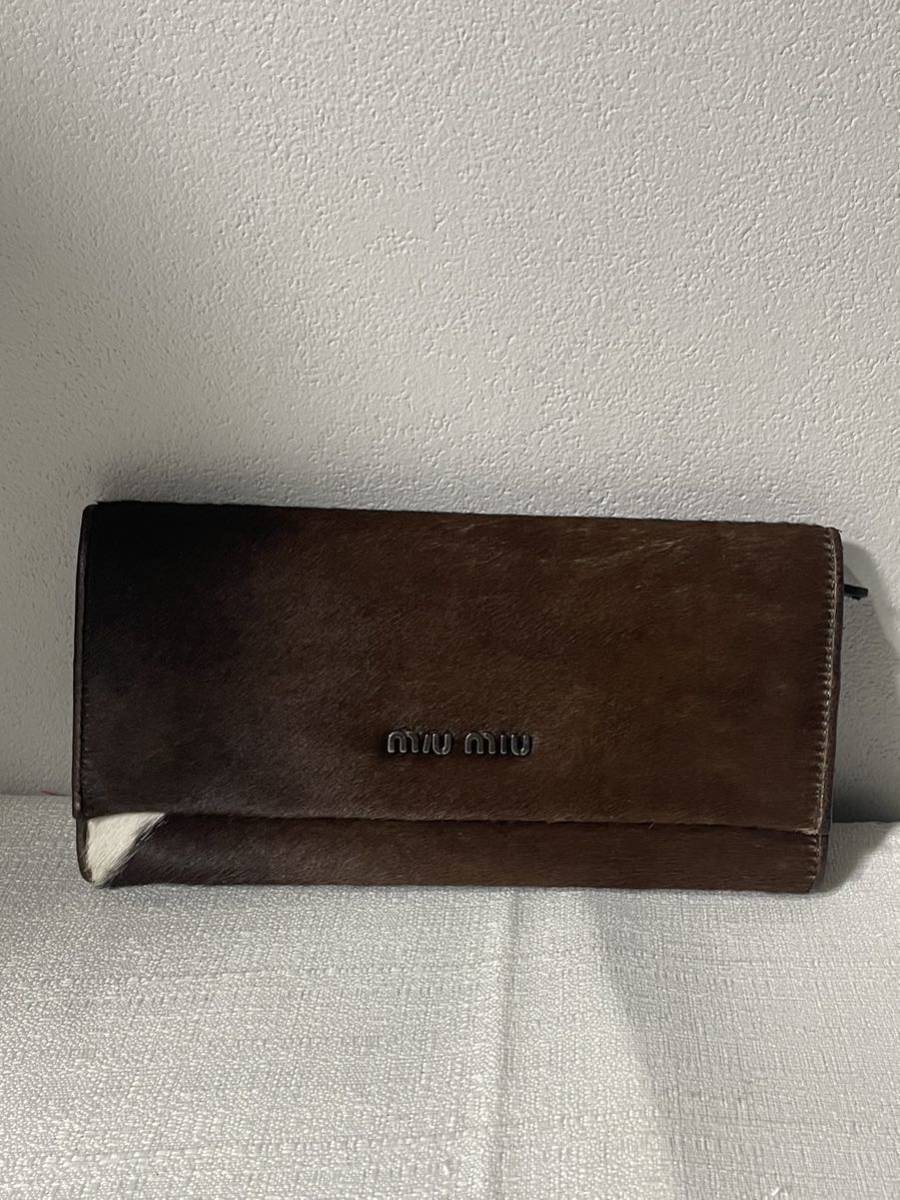 - 【希少】美品ミュウミュウMIUMIU長財布茶本革本物毛皮ハラコレザーレディース