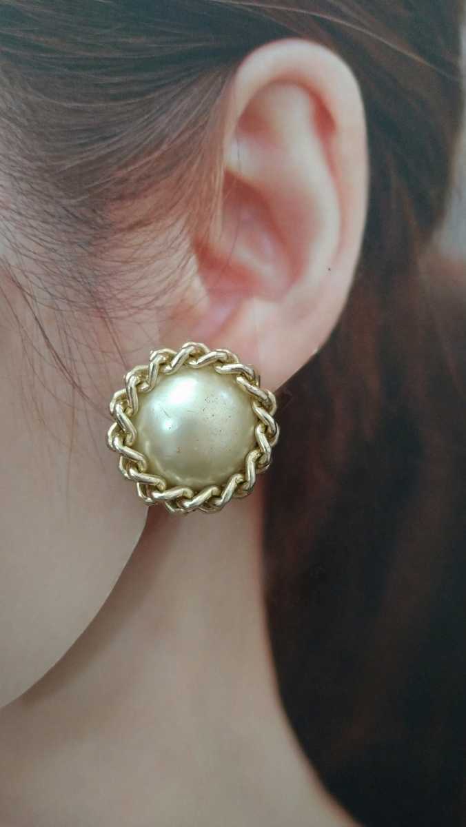- □訳あり□JAPAN刻印□半円パールビジュー×ゴールドカラー・イヤリング□