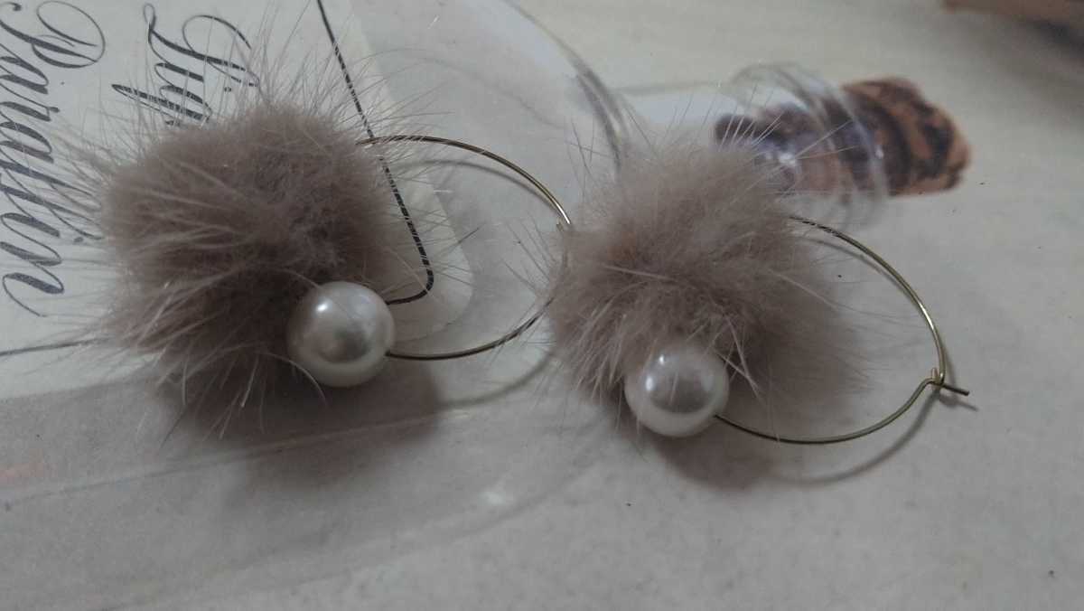 - □訳あり□茶系ファー×パールビーズ・リング・ピアス□