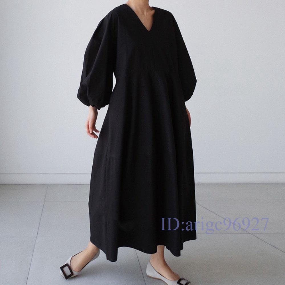 > Q798☆新品春秋 カジュアル 素敵な Vネック 無地 コットン ゆったり 体型カバー 大きいサイズ 長袖 ロングワンピース フリーサイズ 黒