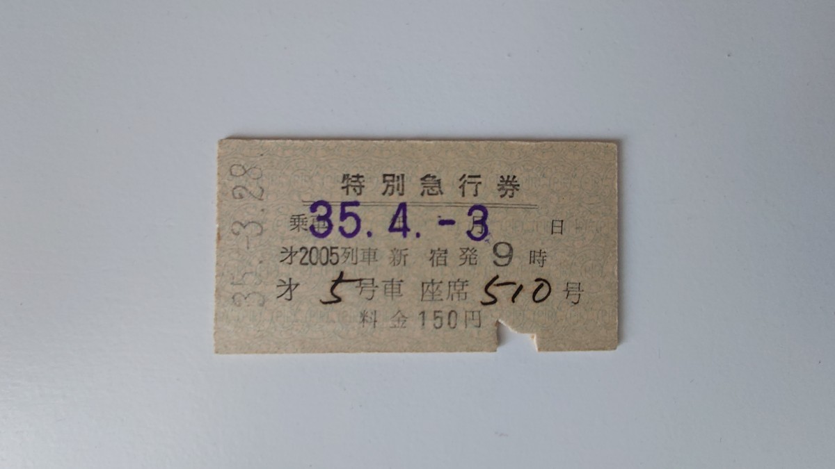 - ▽小田急▽第2005列車新宿発 特別急行券▽A型硬券昭和35年