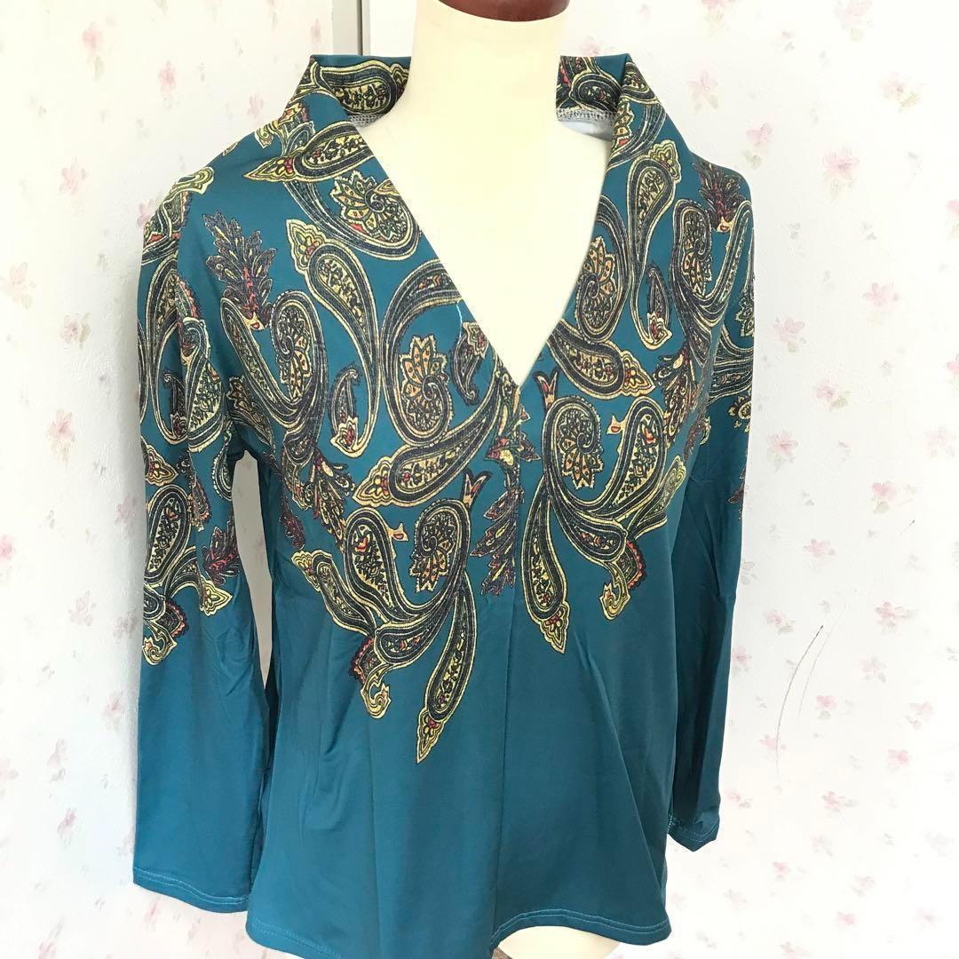 - 【グリーン★L】ペイズリー柄 レディース 長袖 Vネック シャツ