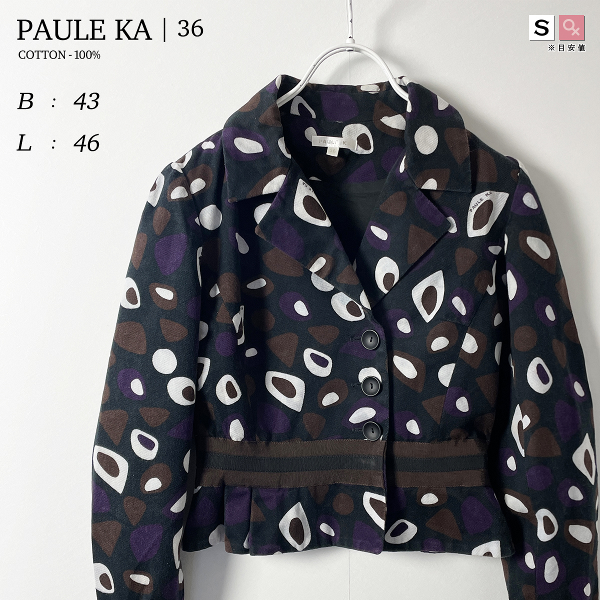 > PAULE KA 綿 100% コットン ドット アニマル 柄 テーラードジャケット 春 秋 ショート 総柄 カジュアル 黒 ブラック 薄手 ポールカ 36 7号