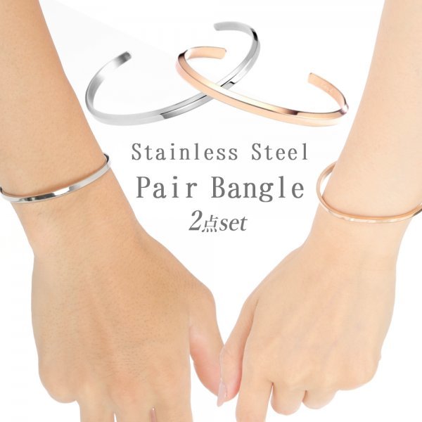 > ステンレス ペアバングル ブレスレット バングル つけっぱなし メンズ レディース 細め シンプル シルバー&ピンクゴールド 2点セット