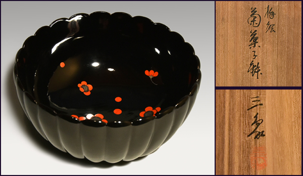 > 三象漆園(造)天然木 京塗 梅絵菊形菓子鉢 口径:19㎝ 高:10.3㎝ 共箱 茶道具 菓子器 漆工芸 漆芸 木工芸 本漆 y0742