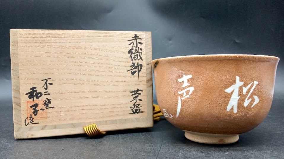 > ▽ 赤織部 茶碗 佐藤 和子 造 / 不二窯 茶道具 抹茶茶碗 茶器 栞付き お点前 茶席 茶事 茶会 在銘 銘 真作