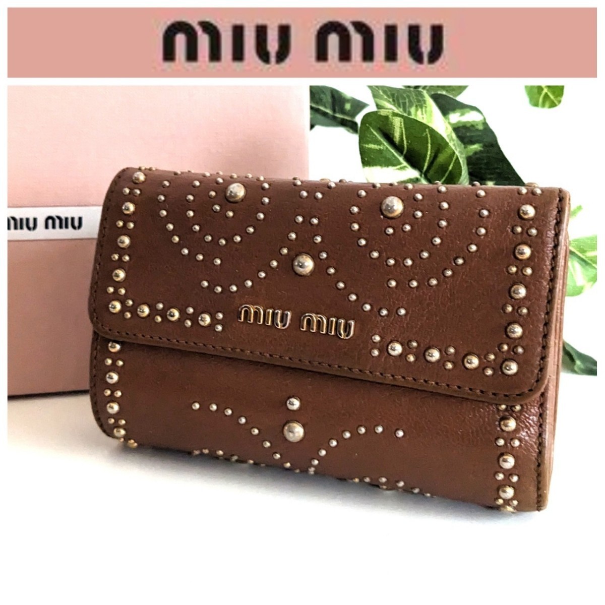 > 良品 ミュウミュウ スタッズ マドラス 本革 レザー 折り畳み 三つ折り 財布 ヴィンテージ プラダ PRADA キャメル ブラウン 茶色 ゴールド