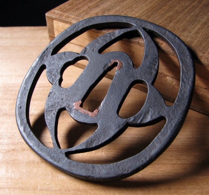 - 時代武具 鉄地透かし鍔 太刀鍔 天保鍔 幅:8.58ccm 桐箱付 江戸時代/鐔/23d002