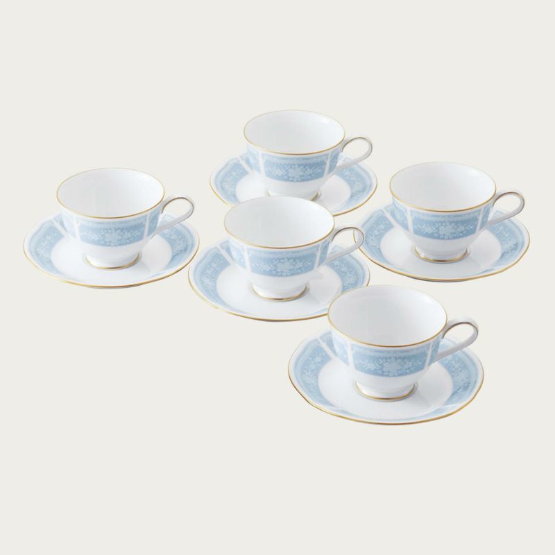 - ノリタケ! ☆レースウッドゴールド(ブルー)5客コーヒー碗皿☆ 新品 コーヒー 紅茶 カップ&ソーサー ギフト