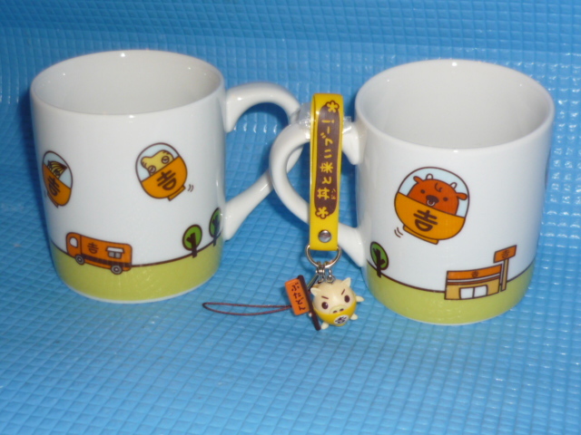 - b★未使用・非売品★吉野家 よっぴー&エックン&オニィ&ジンジーマグカップx2個と吉ブーげんき満開ストラップBoo