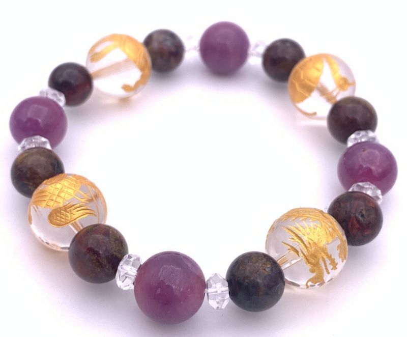 - 風水四神!天然石水晶金彫り12mm玉&ルビー&ピーターサイトのブレスレット