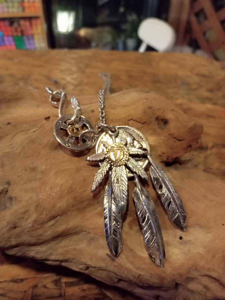 - アメリカ硬貨,5セント,フェザーガンジャ3点吊りネックレス,イーグルフック,ホイール,メタル