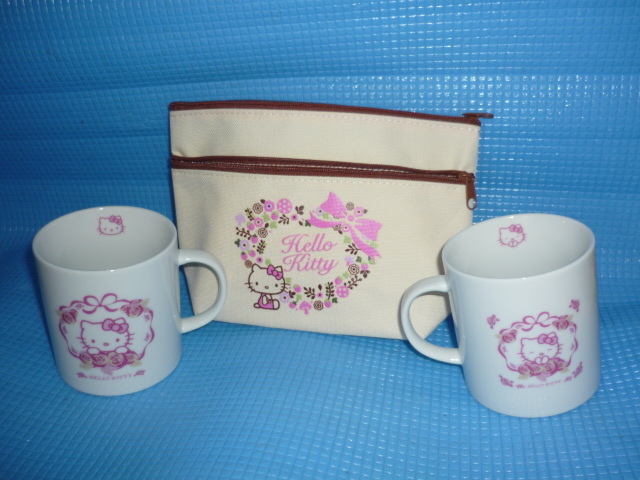 - E★未使用・非売品★2011年ハローキティ 薔薇マグカップx2個とポーチ