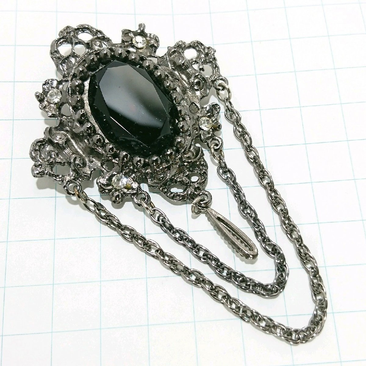 - 送料無料)ビンテージ☆ブラックストーン チェーンエンブレム☆アンティークブローチ A16444