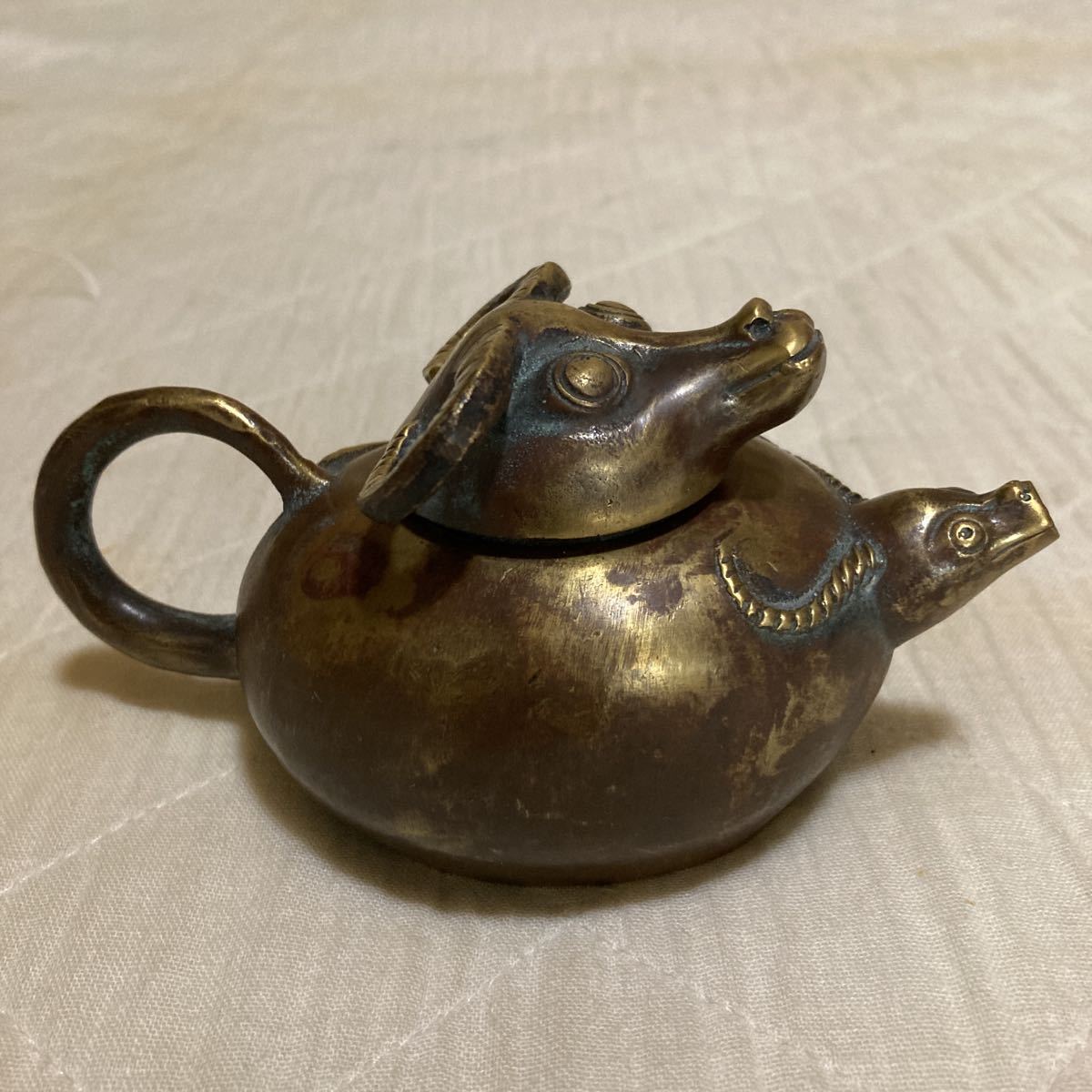 > 古い古銅.水牛の香炉.水滴.壺 .貴重.底に落款.刻印.象嵌.青錆有り.重さ.約336g.横幅.約7cm.奥行き.口から持ち手迄.約13.5cm. 高さ.約6.6cm.