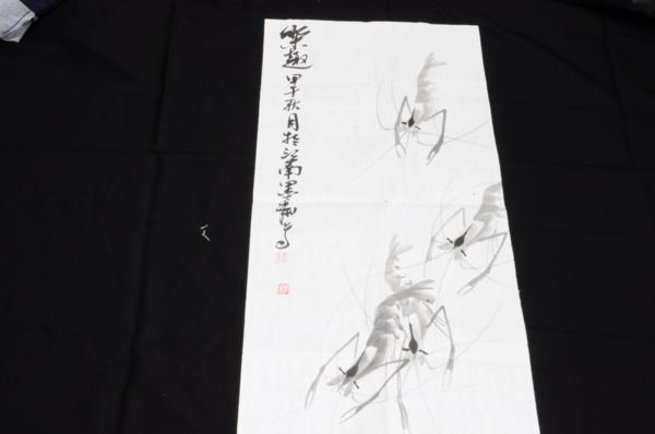 - 墨文字製作所 中国墨彩画作品 手長エビ34*69cm 裏打ち用/軸用/本紙/額/軸製作
