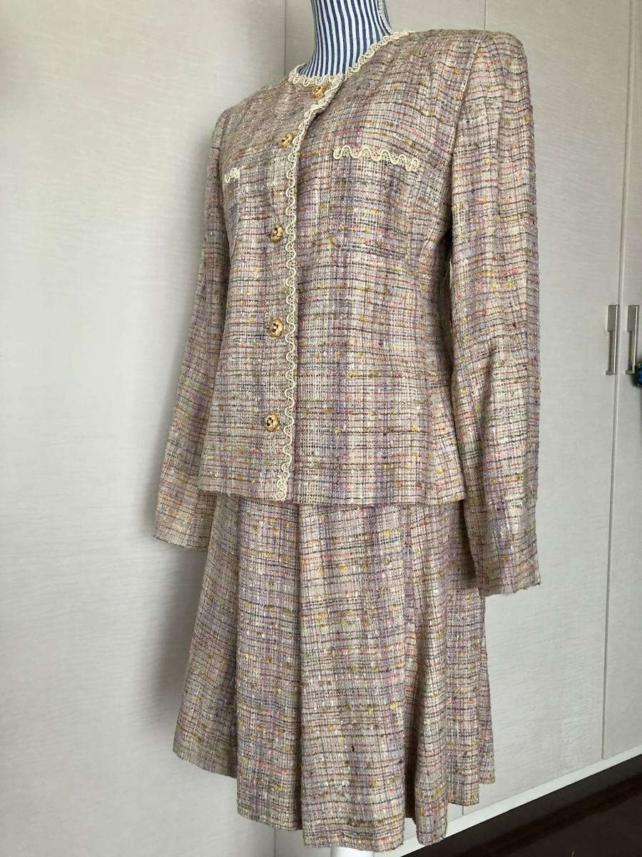 > ■シルクツイード シャネル風スーツ 35万円相当 9号〜11号相当 Aラインフレアスカート スカート丈59㎝ ウエスト3段階フック