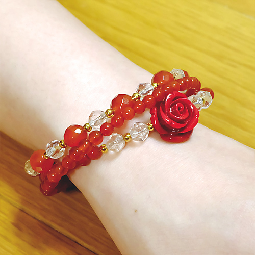 - ★お勧め★人気★エレガント★大人可愛い★バラの貴石★珊瑚パウダー樹脂加工★華やかさ★ブレスレット★一輪のバラの花&白水晶&赤メノウ