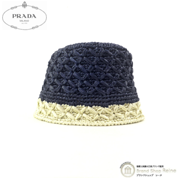 > プラダ (PRADA) ラフィア ビコローレ バケット ハット ストロー 麦わら 帽子 Mサイズ 1H0609 ネイビー×アイボリー(新品)