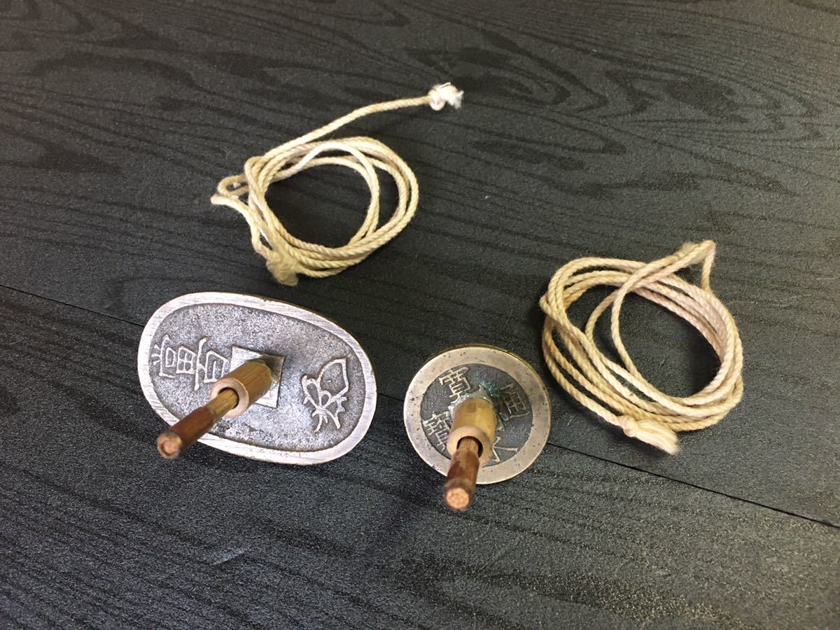 - 昔の硬貨 コマ 手作り 2個セット 天保通寶 當百 古銭 穴銭 寛永通宝