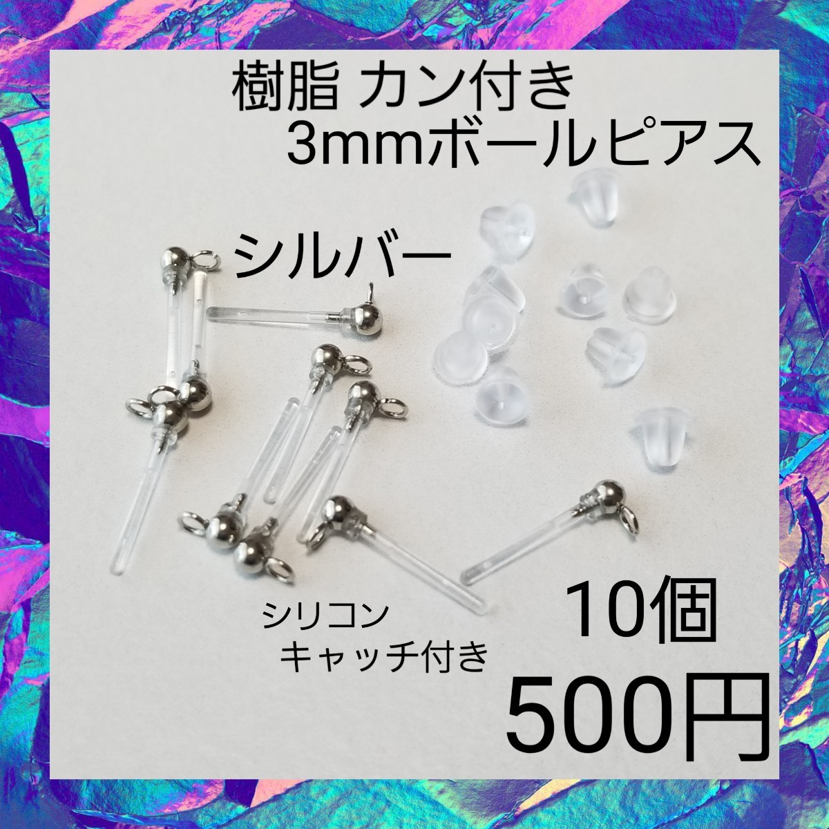- 金属アレルギー対応 カン付き 樹脂 3mmボール ピアス シルバー パーツ 01
