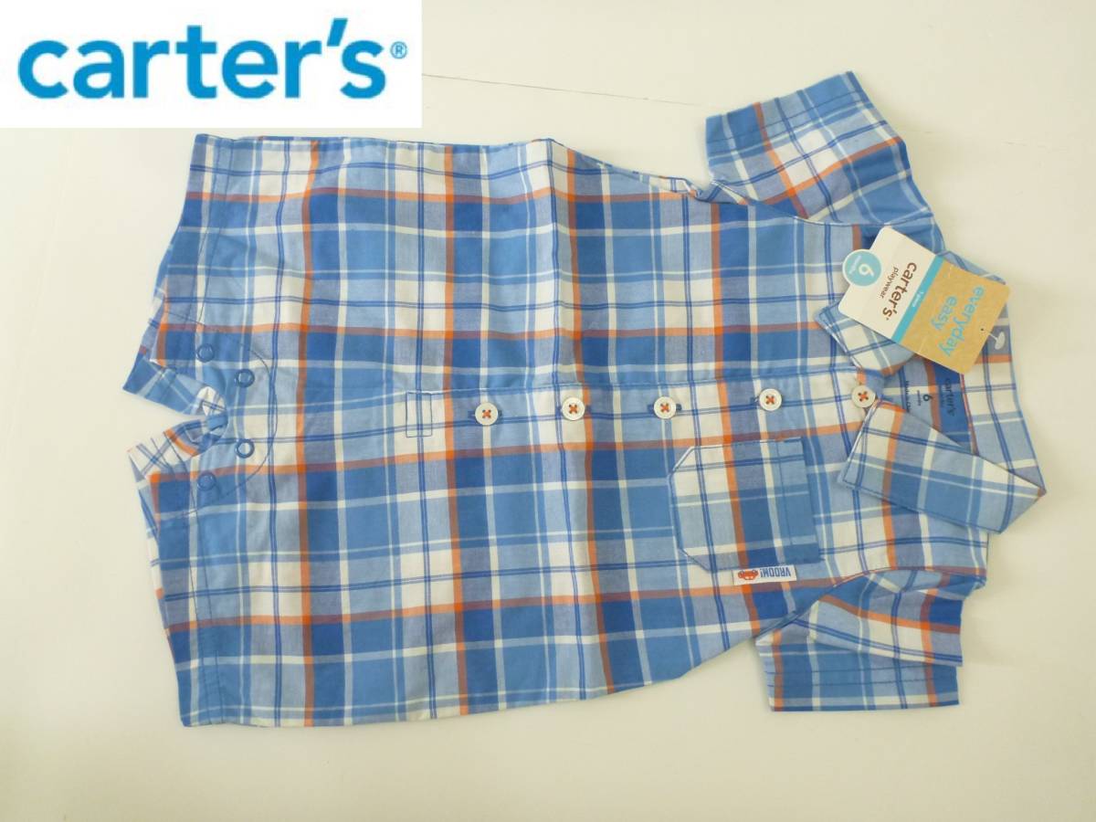 - 新品 carter's カーターズ ★青×白×オレンジ チェック柄 シャツ生地 爽やか 半袖 つなぎ 6m…身長60㎝
