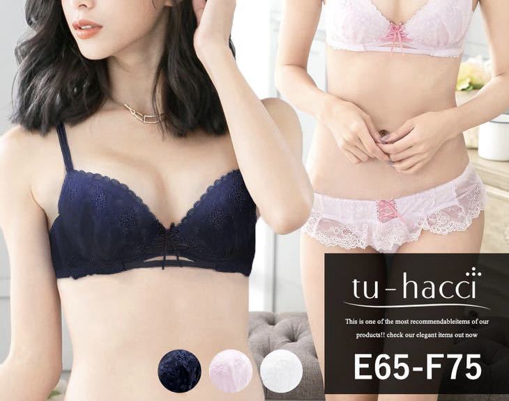 - tu-hacci フラワーモチーフレースアップブラジャー E75 ネイビー