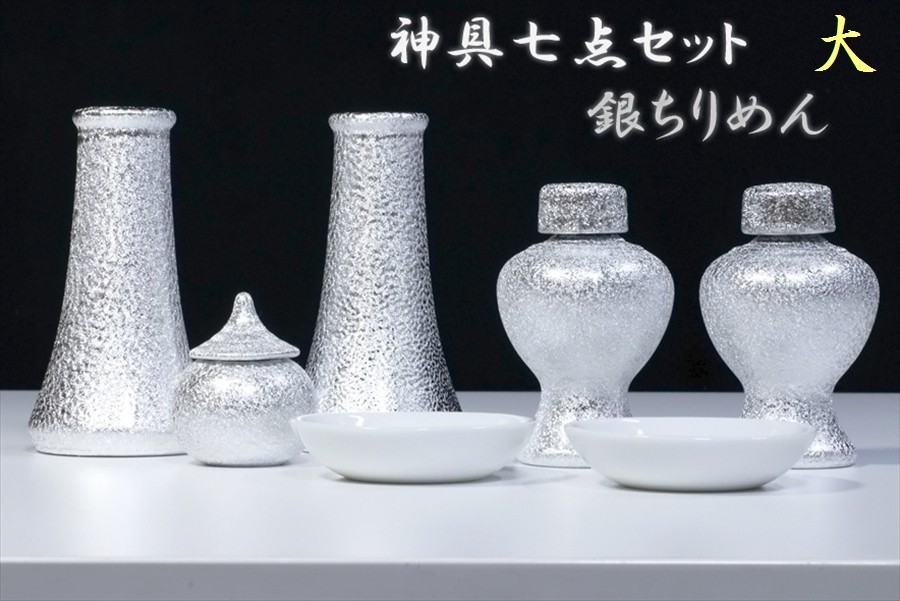 - 希少■神棚用 陶器■神具セット 7点 貴金属調 光沢仕上げ■銀ちりめん■土器■中~大型の神棚に■大