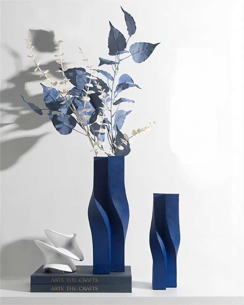 - ブルーの花瓶 ツイストタイプ 青 濃紺 ネイビー モダン クリエイティブ 創造的 花器 フラワーベース 玄関 リビング 幾何学的 セラミック