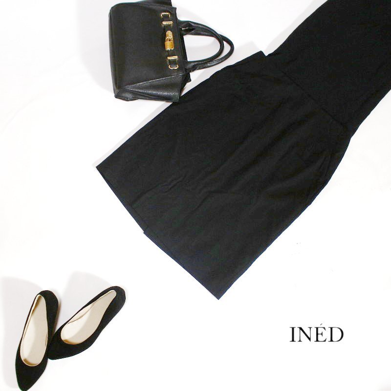 - 美品 イネド INED 株) フランドル 春 夏 シンプル 上品 サマーウール 膝下丈 スーツ タイトスカート 7号 ブラック 黒 フォーマル ビジネス