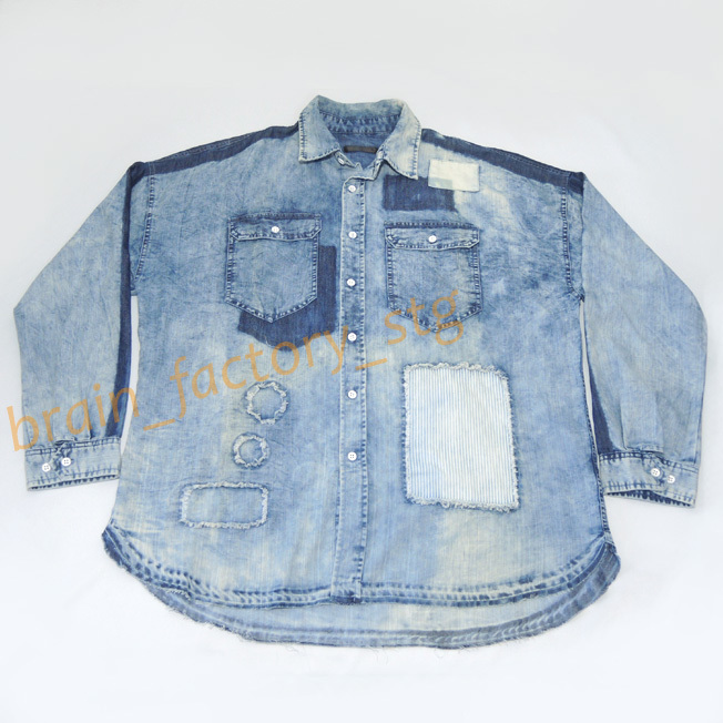 > BIKE STAR(バイクスター)/ムラ染め ダメージ&リペア加工・星条旗 長袖ダンガリーシャツ・デニムシャツ-sizeFREE- /管HVDQ