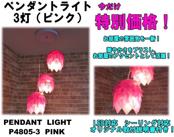 - ペンダントライト 3灯 LED対応 シーリング 吊下げ シャンデリア 室内照明 アンティーク リビング ダイニング 照明器具 かわいい ピンク①