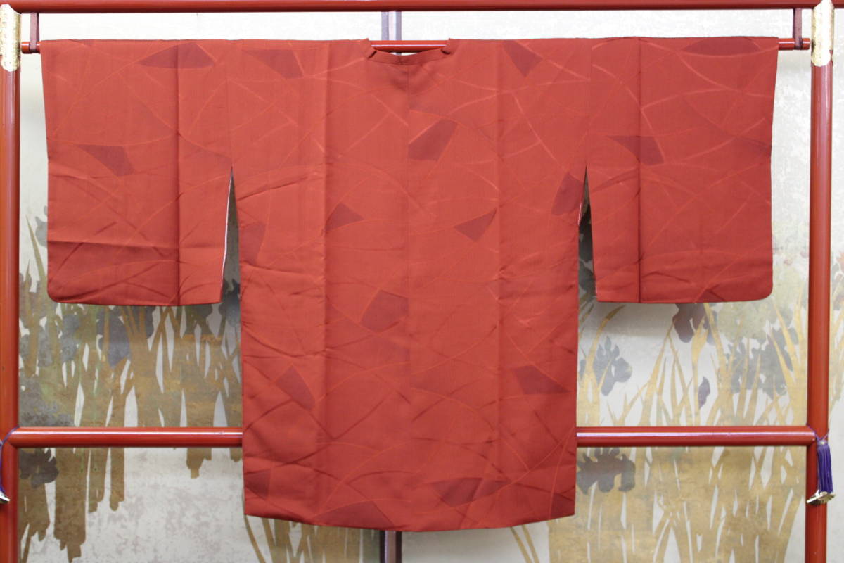 - きもの今昔5628 道行コートコレクション 正絹高級紋意匠地 臙脂色地模様は割付けの図案柄 コート丈86cm