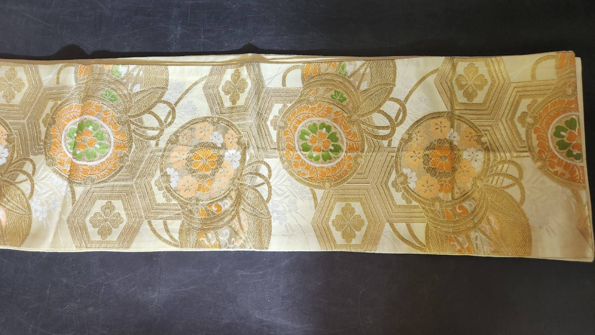 - 着物帯 華柄 金色 薄黄色 約403cm