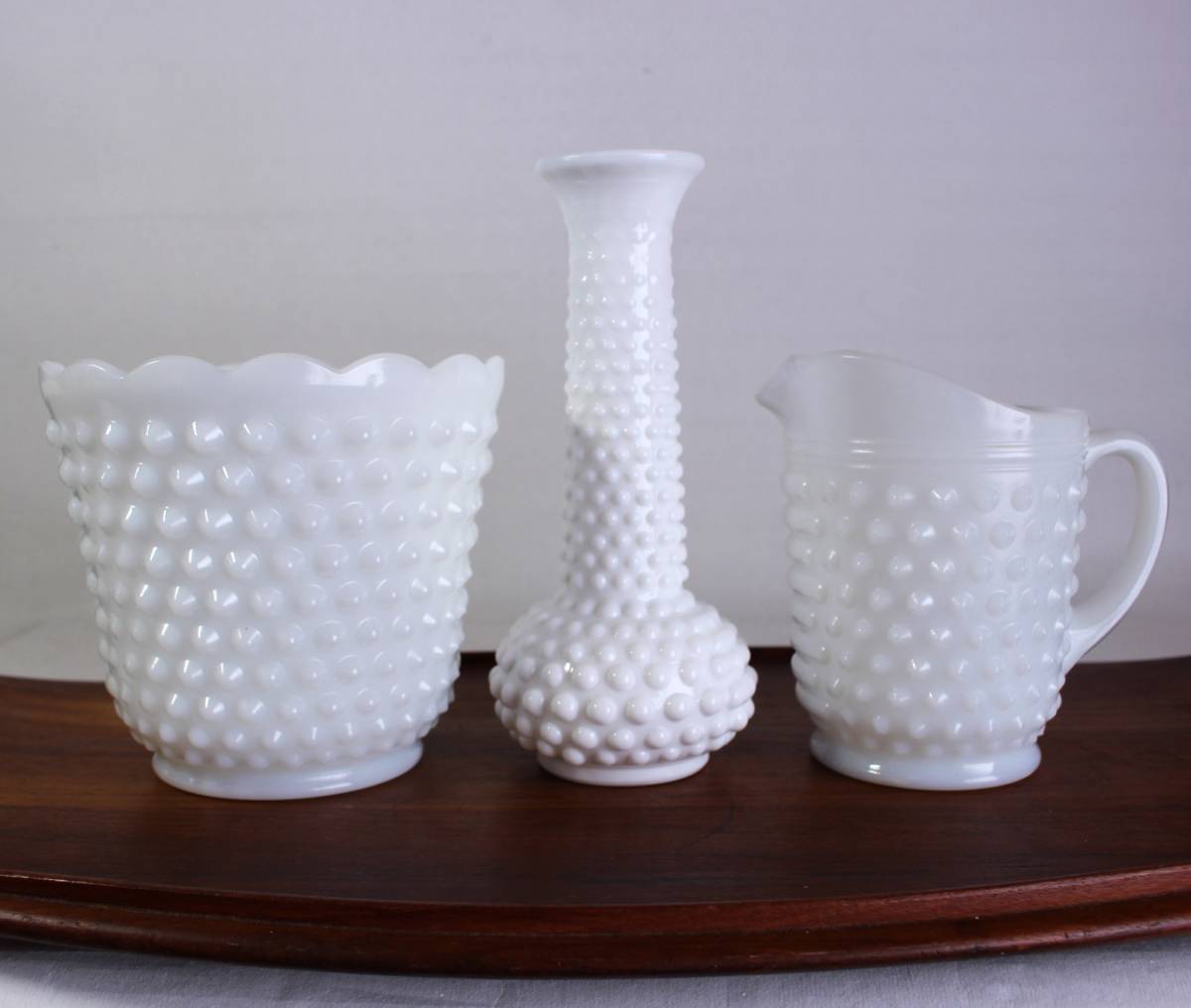 - 送料無料 美品! 3ピースセット! ファイヤーキング FIRE KING ホブネイル ホワイト 白 フラワーポット ピッチャーフラワーベース E.O.BRODY