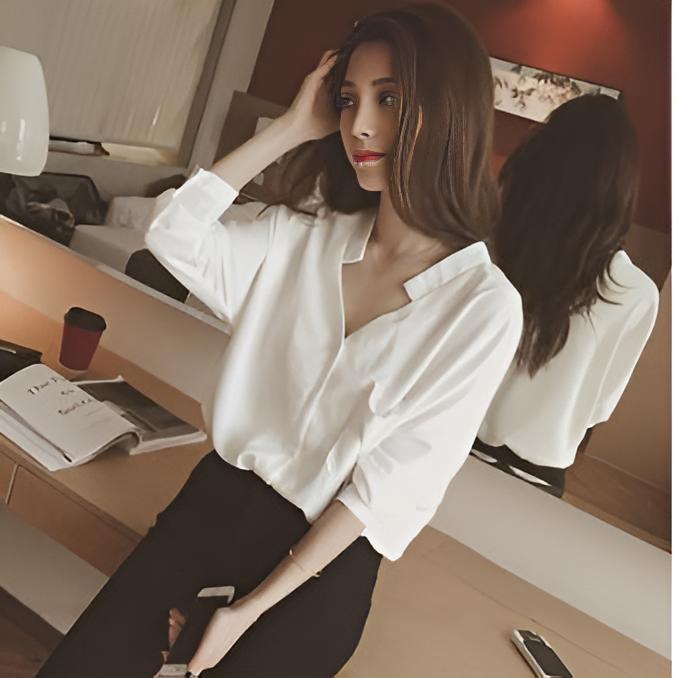 - 新10-1.ブラウス Vネック 7分袖 シャツ シンプル 白 オフィス L
