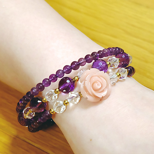 > ★人気★お勧め★パワーストーン★エレガント★大人可愛い★バラの貴石★華やかさ★ブレスレット★一輪のバラの花&白水晶&アメジスト★
