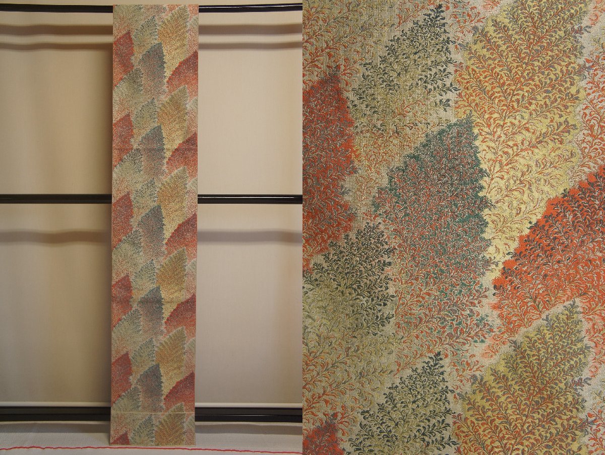 > 特選『萬葉』本袋紹巴地利休白茶色木立模様未着用全通袋帯[O14594]