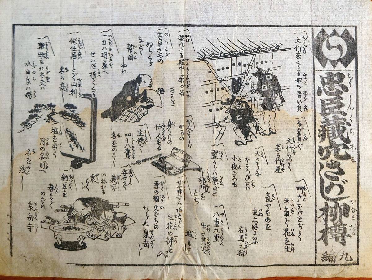 - f230900806〇一枚刷り 浪花みやげ第2編第3集 忠臣蔵穴さがし柳樽 9編 ことば遊び しゃれ なぞ 判じ絵 見立番付 天保年間 塩屋喜兵衛板