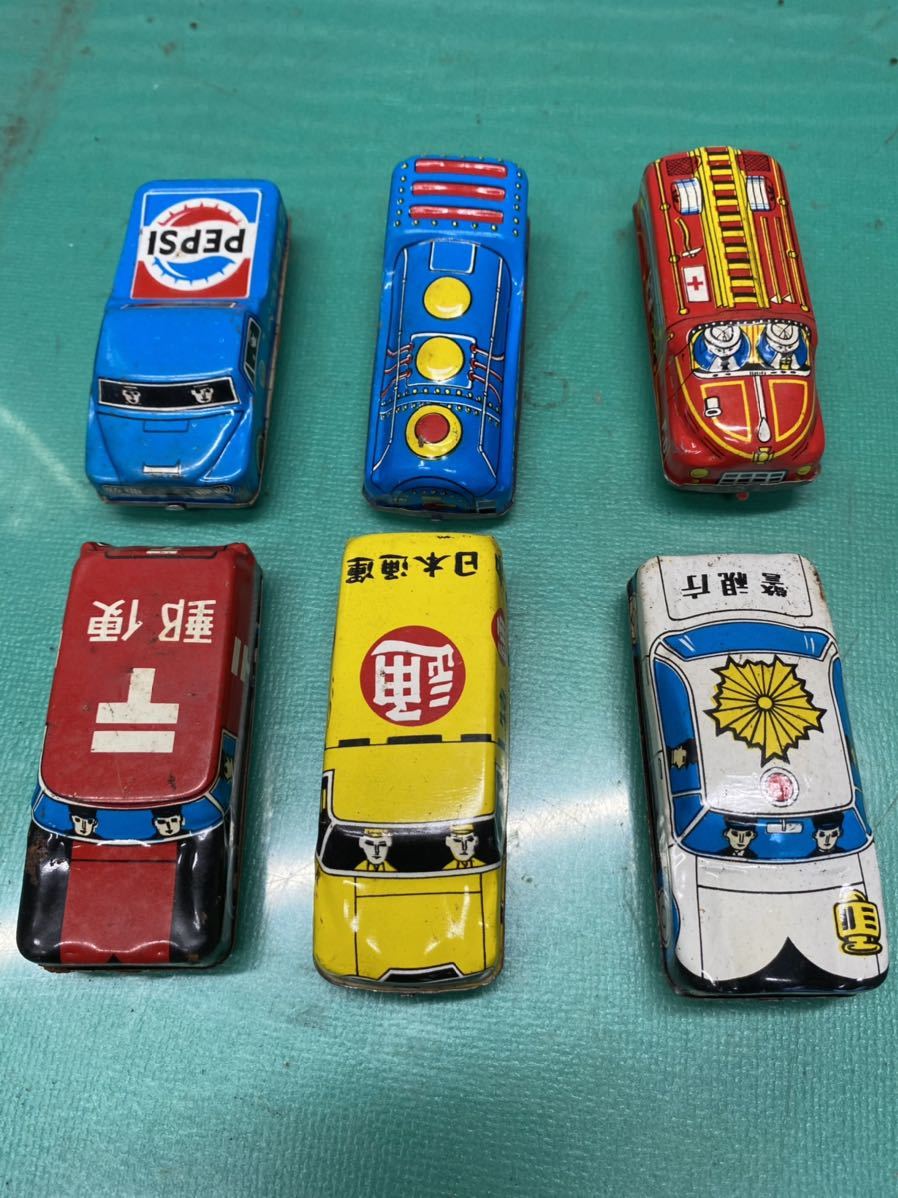 > (1709) 当時物 昭和 ブリキカー まとめて6点 60年代 サイズ約全長8cm 郵便 警察庁 消防車 ペプシコーラ 日本通運 電車 日本製