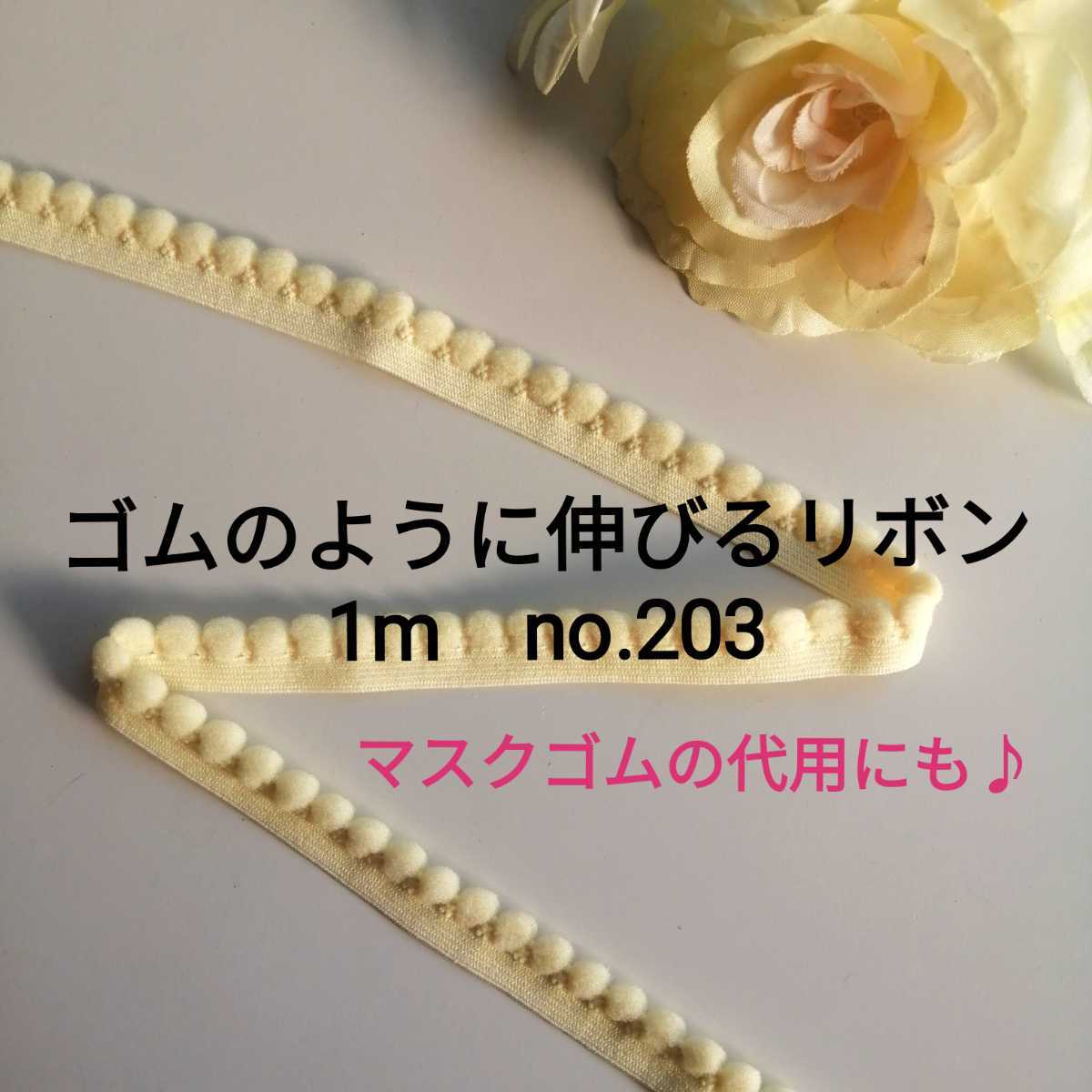 - no.203 黄色クリーム ストレッチ リボン長さ約1m 幅約1.3cm ゴムのように伸びるリボン ポンポン テープ 縁取り 裾 手作り 材料 フリンジ