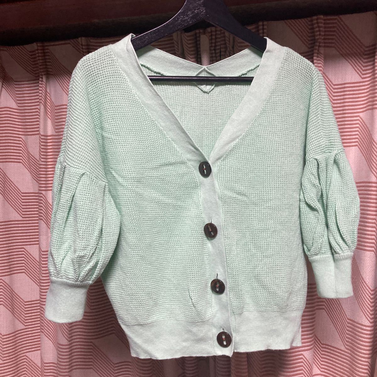 - socolla五分袖ワッフルカーディガン羽織ミントグリーンショート目サイズ2Mくらいバルーン袖かわいいミニマムラグランドルマン